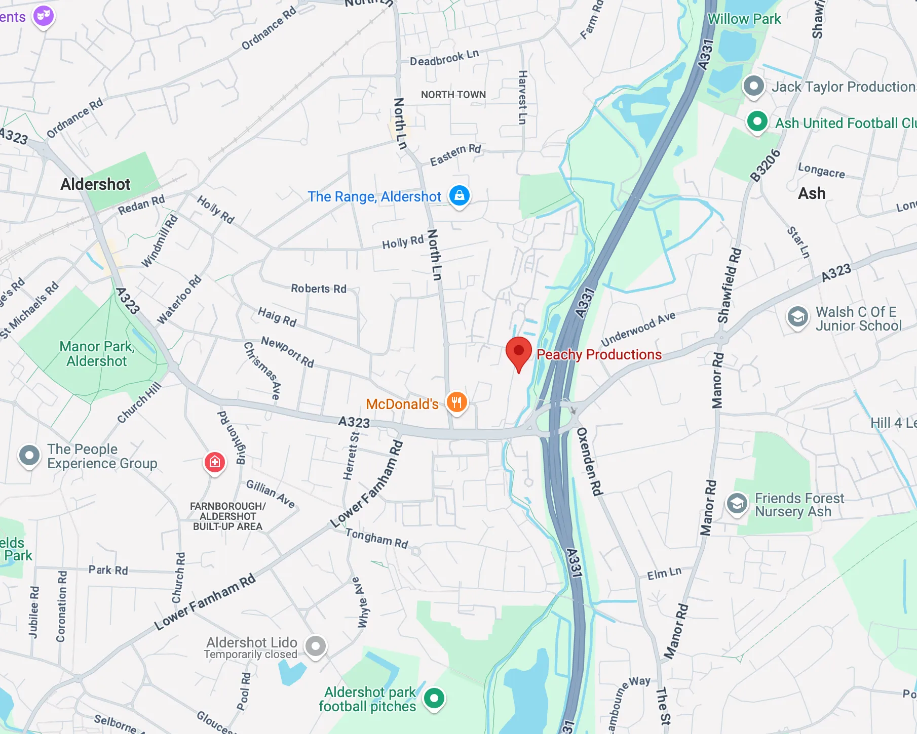 Peachy Warehouse is located just off the A331 in Aldershot, a 10 minute drive from the M3 and 15 minutes from Guildford.